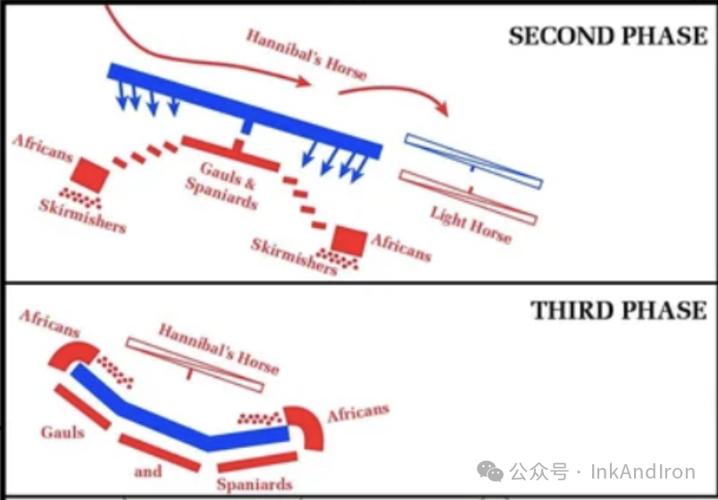 The battle began with the huge Roman center advancing as one against the thin line of Gauls and Spaniards in the center, gradually forcing it to give ground. At the same time, the Numidian cavalry on Hannibal’s right tied down the Roman allied cavalry, while Gallic and Spanish cavalry under Hasdrubal charged the weaker Roman cavalry on the left, soon completely routing it from the field. Instead of pursuit, Hasdrubal regrouped, and circled around from the back to attack the allied cavalry on the Roman right, which promptly fled the field, attacked from two sides. In the center, the massive Roman columns still ground forward, when suddenly the elite African infantry on the sides suddenly appeared on the Roman center’s left and right, now bereft of any cavalry, as shown in the maps below.