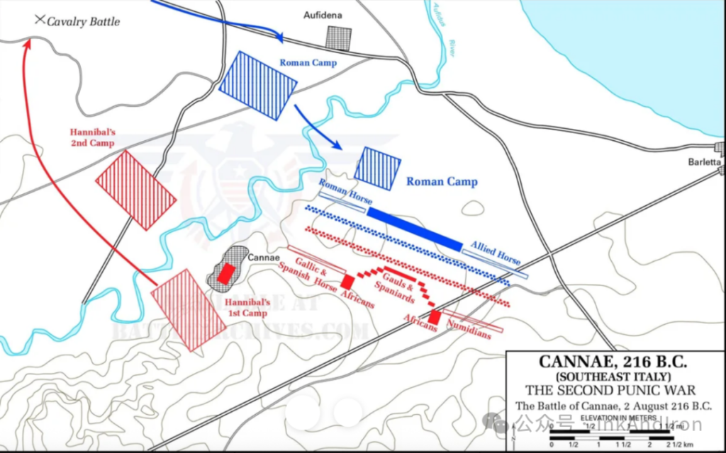 These losses initially prompted the Romans to avoid pitched battles with Hannibal and instead try to cut his supply lines and wear him down. This strategy, known as the Fabian strategy–after consul Quintus Fabius Maximum who implemented it– soon became deeply unpopular with the Romans, who, after recovering from their initial shock, resolved to confront Hannibal directly with the largest army Rome had ever brought into existence at that time: 8 legions, totaling 86,400 men–80,000 infantry, 6,400 cavalry–facing Hannibal’s now 50,000-strong army, composed of 40,000 infantry and 10,000 cavalry. Yet Hannibal still held the advantage in cavalry, not only in quantity, but also in quality.