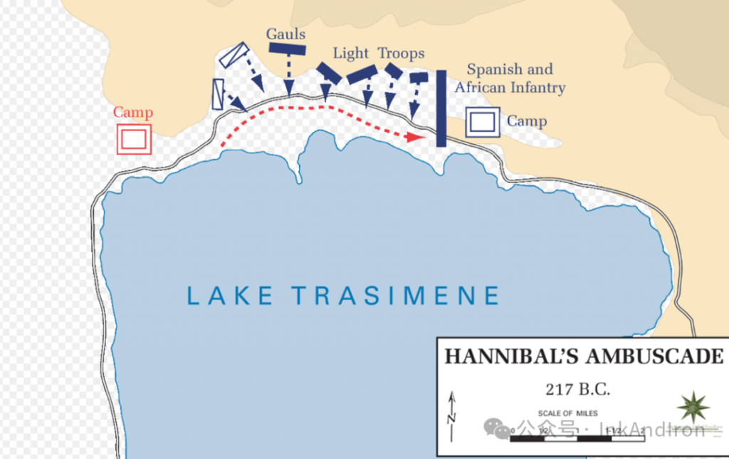 Hannibal then crossed into Italy by traversing the Pyrenees and then the Alps, emerging with a much reduced force of around 20,000 infantry and 6,000 cavalry due to brutal Alpine conditions and hostile tribes. In spite of this, he quickly gathered allies–local Gallic tribes hostile to Rome– and won major victories over the Romans at Trebia, where he executed an envelopment and inflicted 20,000 casualties on a Roman army of 40,000, and at Lake Trasimene, where he ambushed a Roman force, driving it into a lake and annihilating all 25,000 men along with a cavalry detachment of 4,000–effectively destroying two Roman armies.