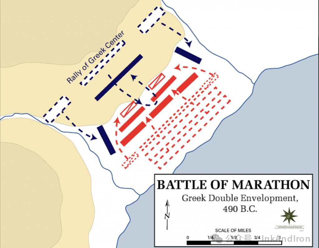 If you will take a look at the map below, you can clearly see how the Persian center moved forward, how the Greek center fell back, and how the Greek hoplites moved inward from left and right, crushing the Persian center.